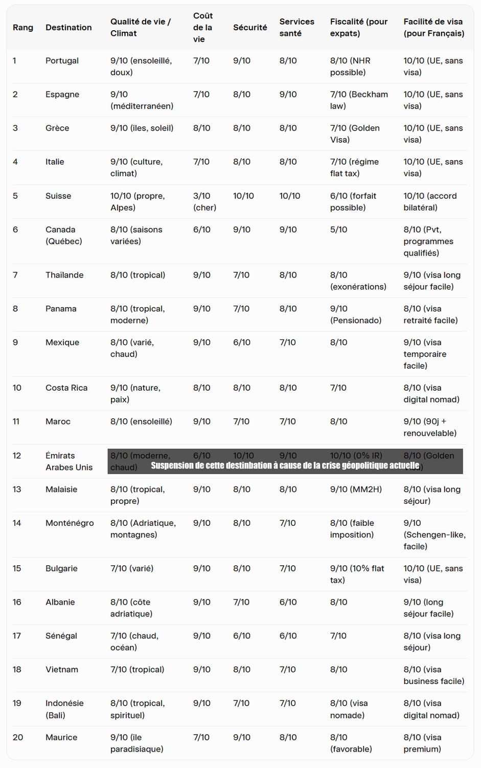 Santé & sécurité : Suisse, Canada, Portugal, Émirats et Maurice excellent ; attention aux zones variables en Amérique latine ou Afrique.